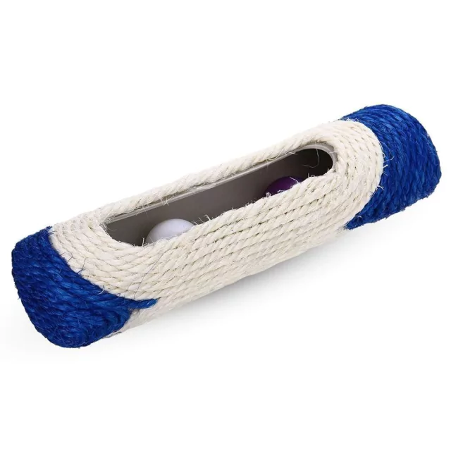 Exclusivo rascador para gatos recubierto en soga sisal. De forma cilíndrica, contiene pelotas en su interior que emite sonido cuando el animal lo mueve. La pelotas están a la vista del gato a través de 2 aberturas y permiten jugar con ellas metiendo la pata.